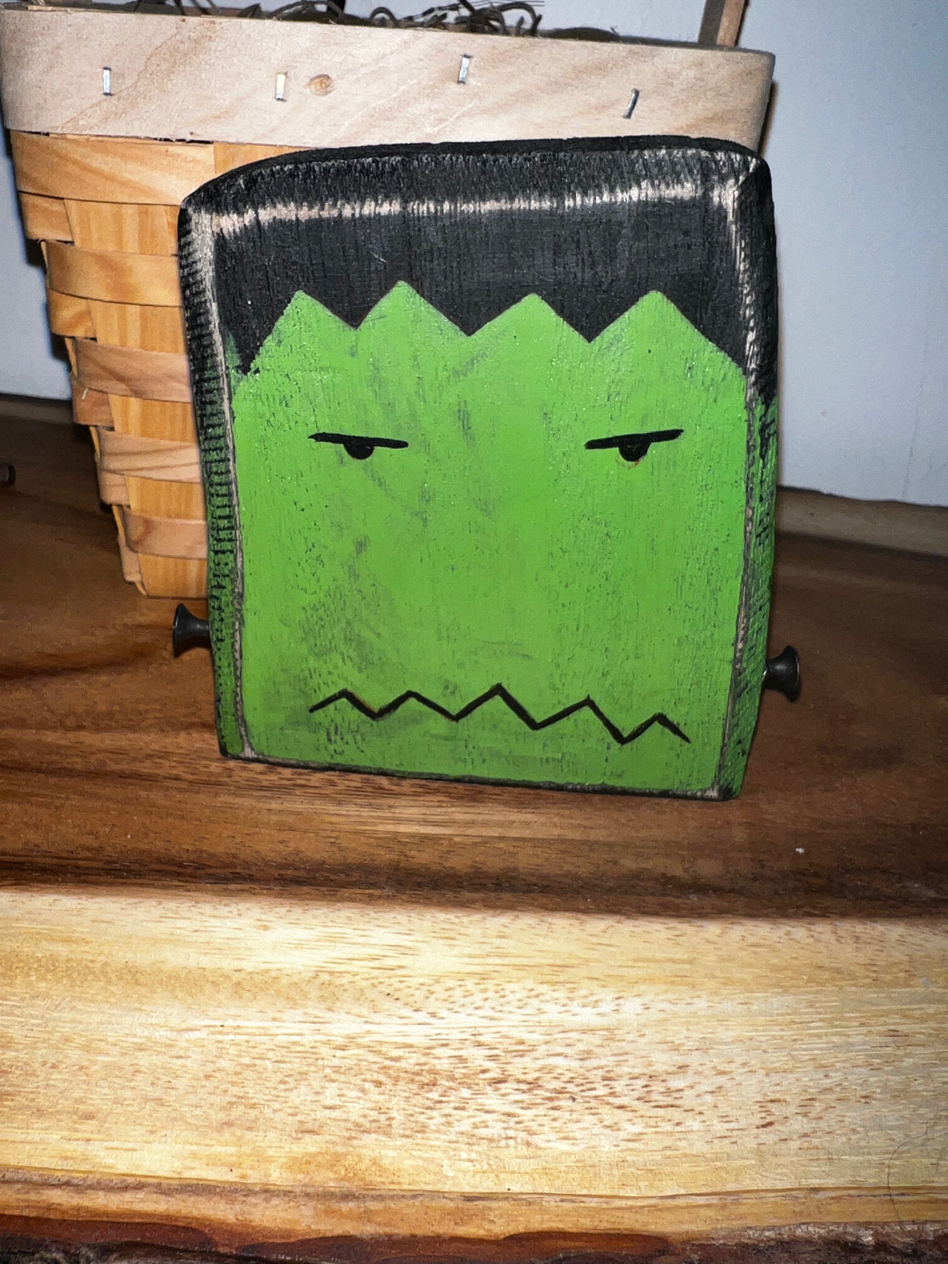 A wooden sitter displaying a green monster head recreated from an original hand carved and painted piece with distressed details. Sitter features metal screw accents to create a handmade feel. Our Monster Head chunky sitter is designed to free-stand alone on flat surface. A fun seasonal home accent that adds character to any display.